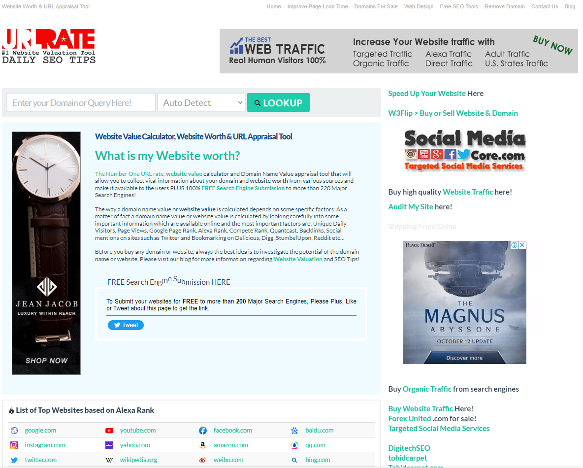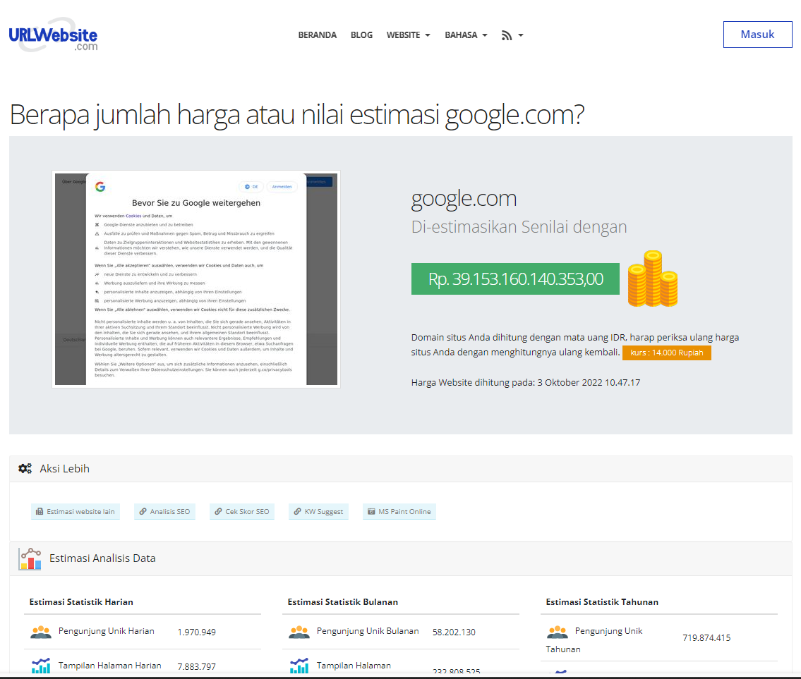 Urlrate.com membutuhkan waktu proses harga situs yang sedikit lebih lama. Tetapi, kalian akan mendapat metrik penilaian yang cukup lengkap. Mulai dari traffic report, search engine indexes, safety information, dan lain sebagainya.