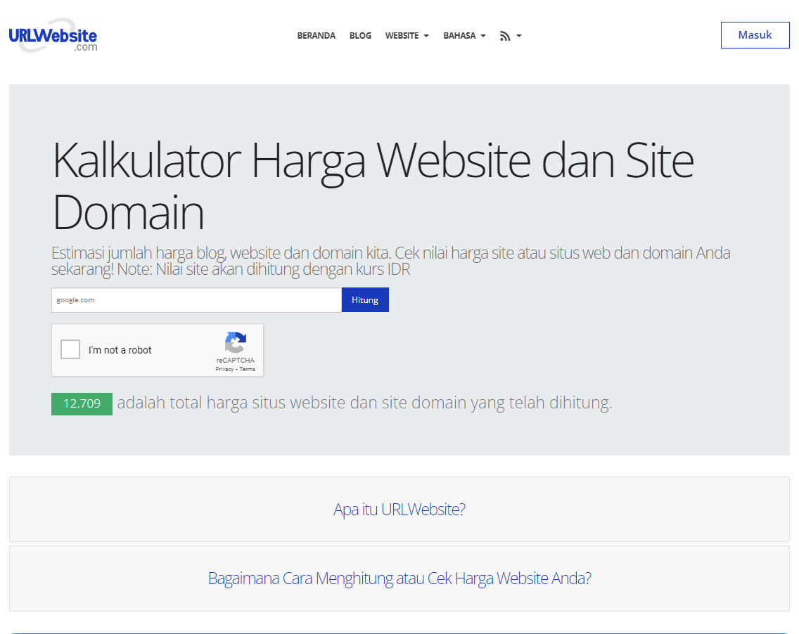 Urlwebsite.com merupakan situs cek harga web yang cukup simple. Kalian hanya perlu memasukkan link alamat website kalian, tekan tombol Hitung. Tidak lama kemudian, situs akan menampilkan harga web kalian dalam satuan rupiah.